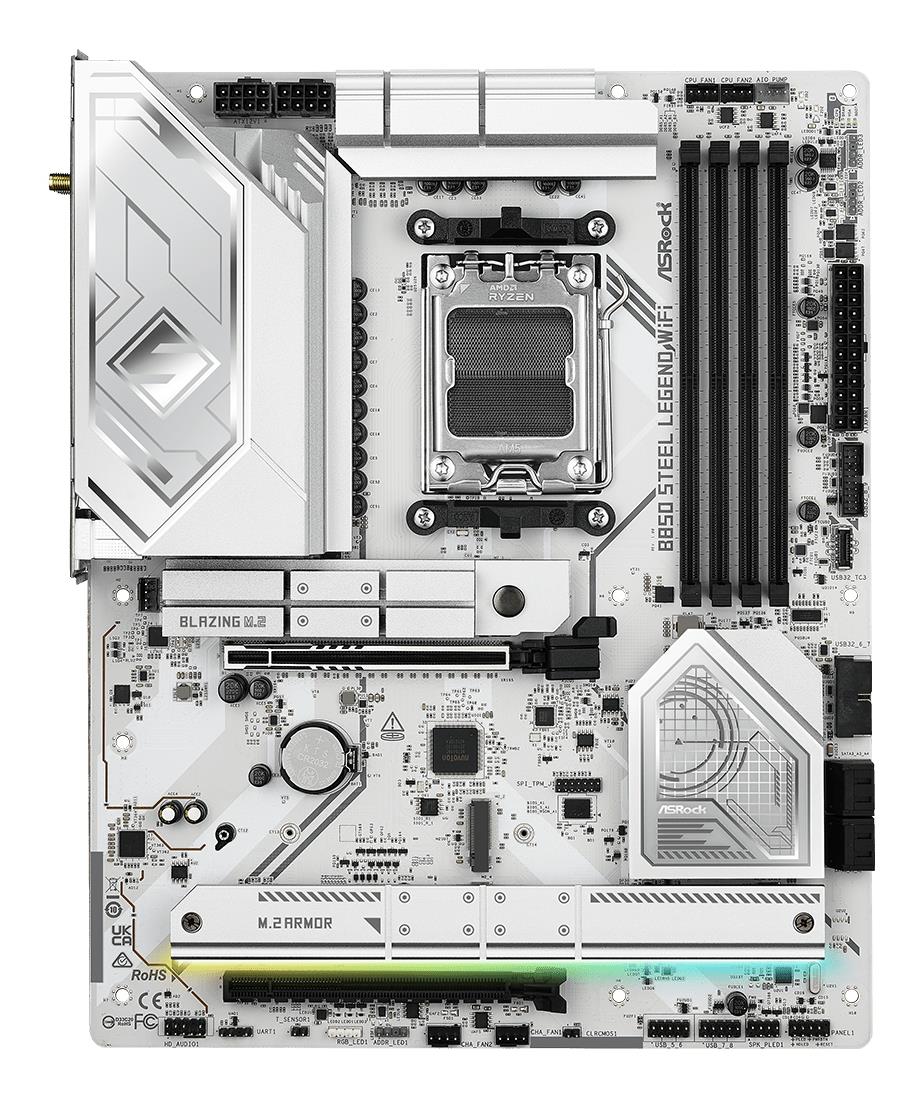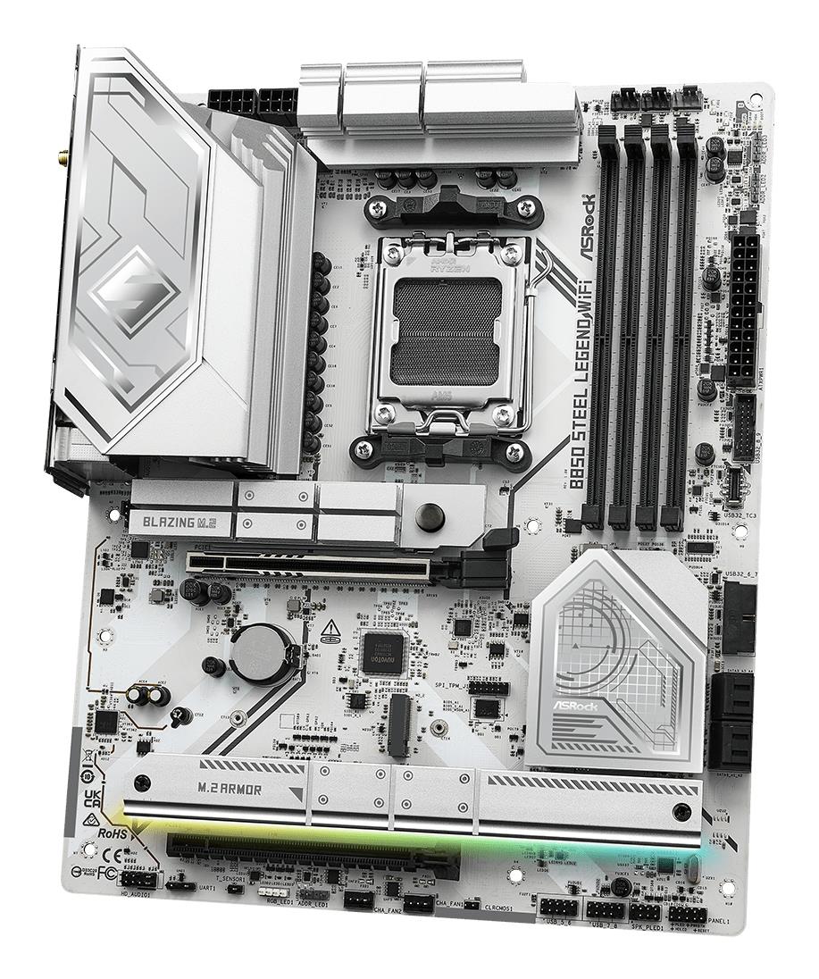 Asrock B850 Steel Legend WiFi. Processor manufacturer: AMD, Processor socket: Socket AM5, Compatible processor series: AMD Ryzen 7000 Series, AMD Ryzen 8000 Series, AMD Ryzen 9000 Series. Supported memory types: DDR5-SDRAM, Maximum internal memory: 256 GB, Memory slots type: DIMM. Supported storage drive interfaces: PCI Express 4.0, PCI Express 5.0, SATA III, Supported storage drive types: HDD & SSD, RAID levels: 0, 1, 10. Maximum resolution: 3840 x 2160 pixels. USB connector type: USB Type-A, USB Type-C