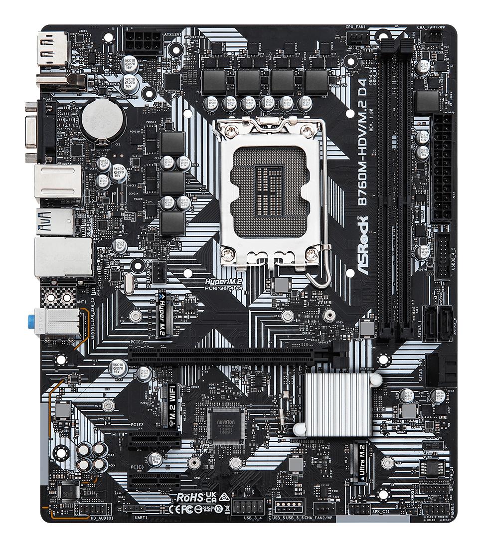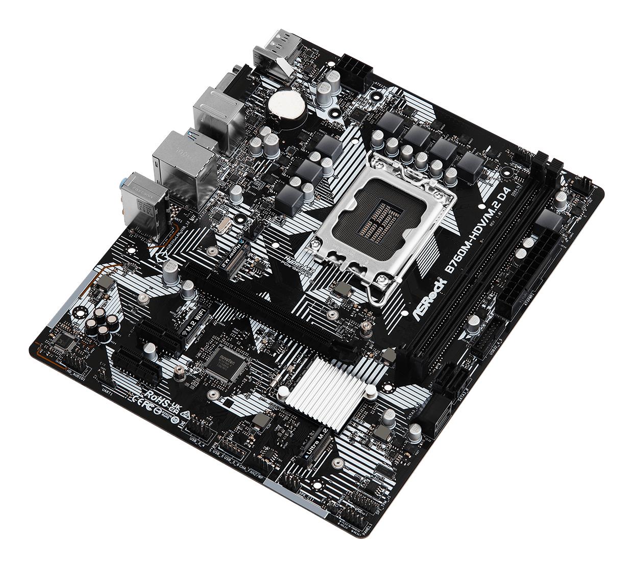 Asrock B760M-HDV/M.2 D4. Processor manufacturer: Intel, Processor socket: LGA 1700, Compatible processor series: Intel® Core™ i3, Intel® Core™ i5, Intel® Core™ i7, Intel® Core™ i9. Supported memory types: DDR4-SDRAM, Maximum internal memory: 64 GB, Memory slots type: DIMM. Supported storage drive interfaces: M.2, SATA III, RAID levels: 0, 1, 5, 10. Ethernet interface type: Gigabit Ethernet, LAN controller: Realtek RTL8111H. Component for: PC, Motherboard form factor: micro ATX, Motherboard chipset family: Intel