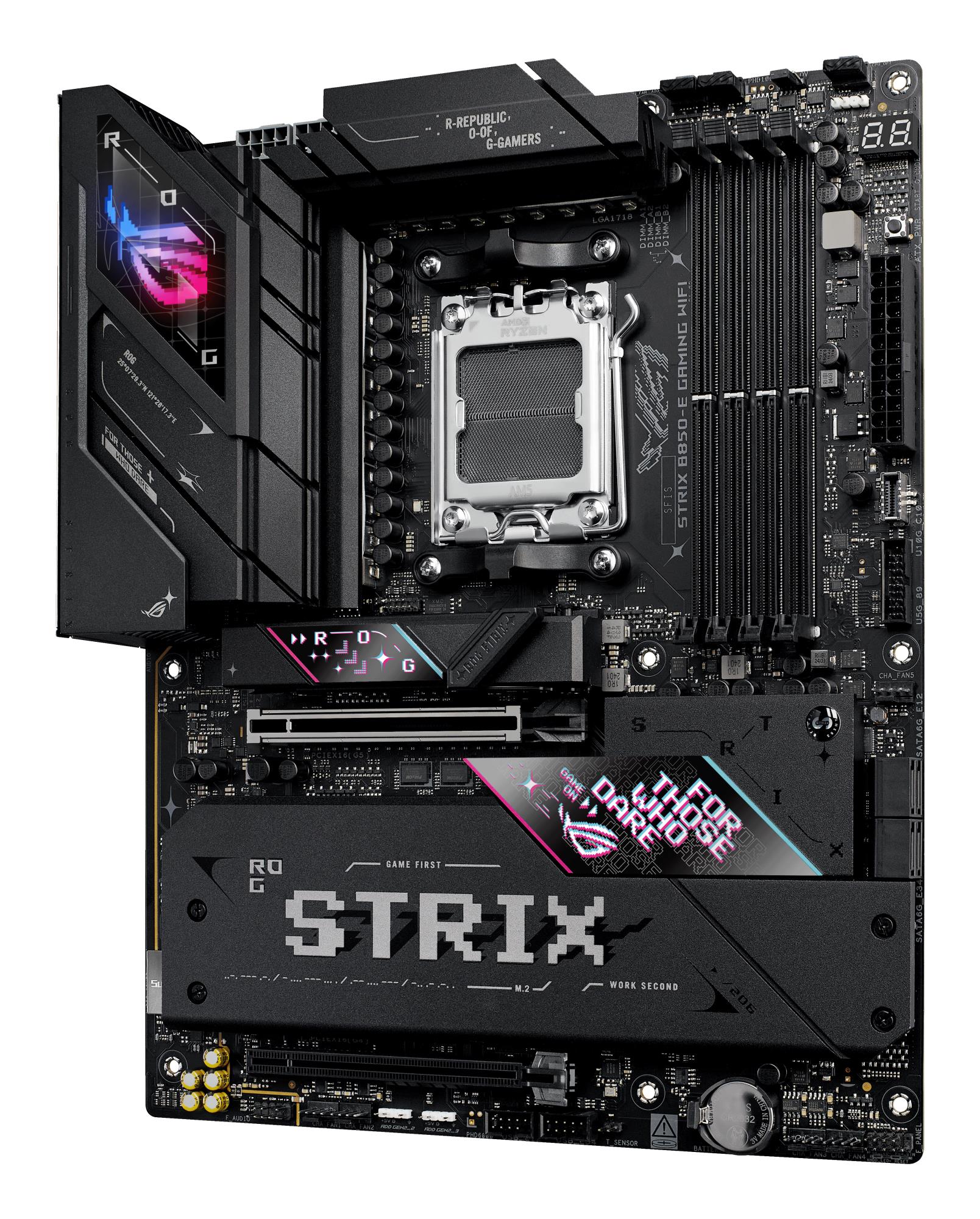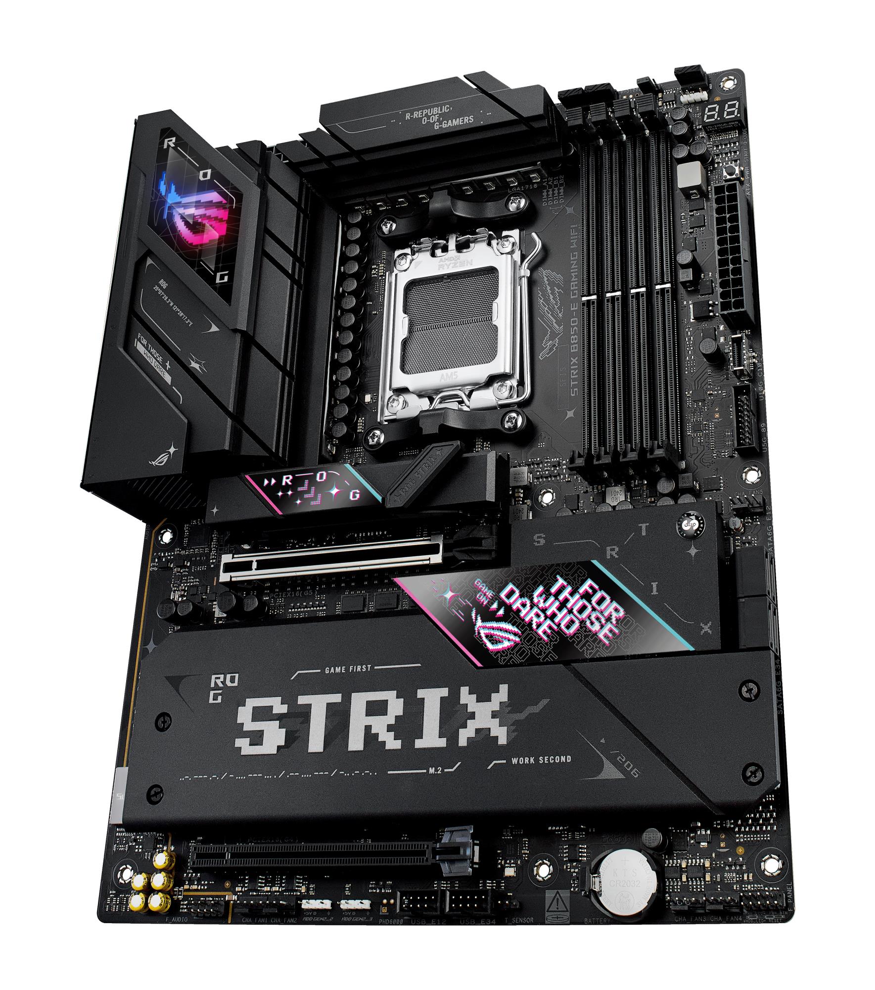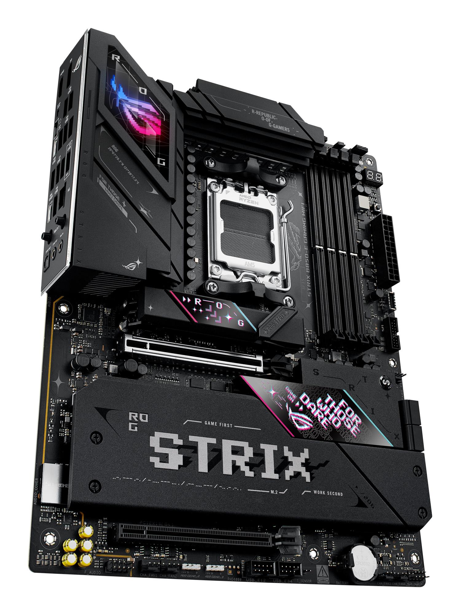 When only the fastest will do, a Strix B850 motherboard delivers. With USB 20Gbps onboard along with robust overclocking¹ capabilities, featuring faster dual-channel DDR5 memory support, AMD EXPO™ technology and PCIe® 5.0 support for both graphics and NVMe, you can play the most demanding games and deliver your biggest projects with the revolutionary performance of an AMD 800-series motherboard and AMD Ryzen™ 9000, 8000, and 7000 Series processors.
