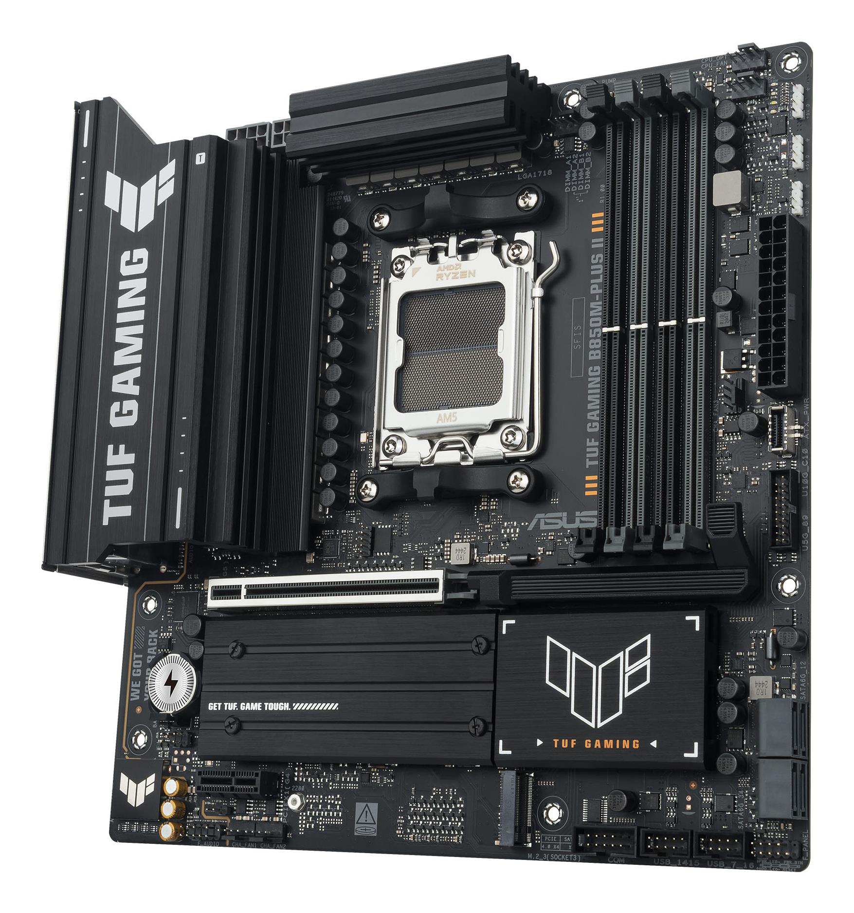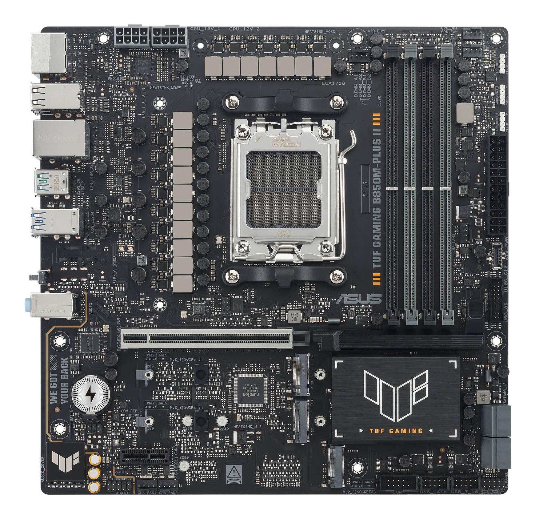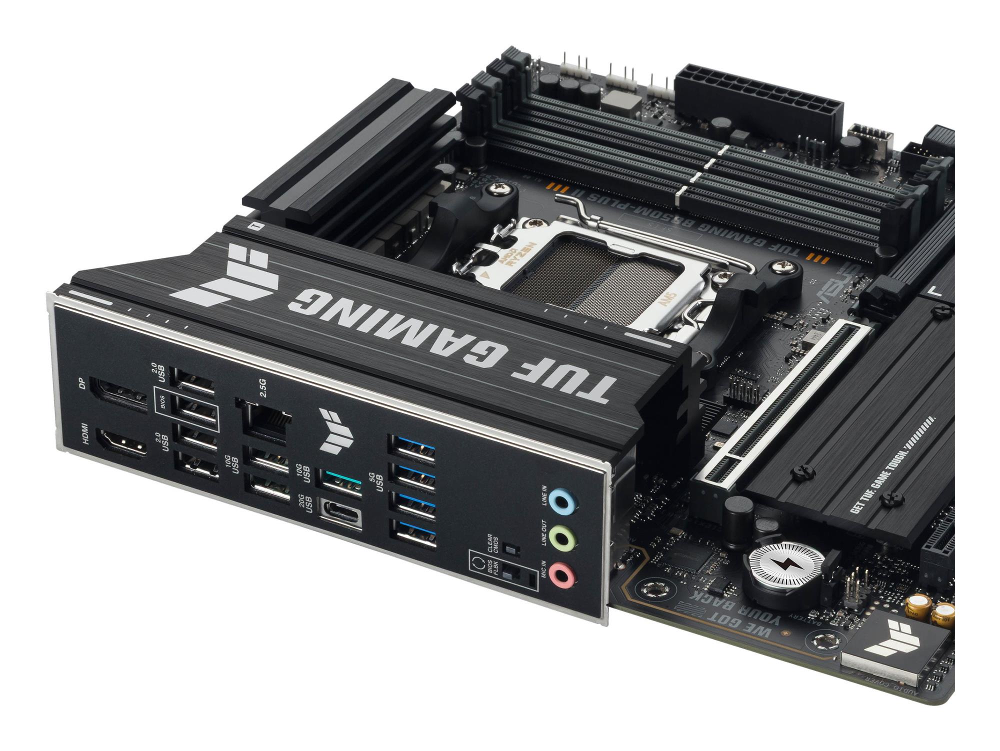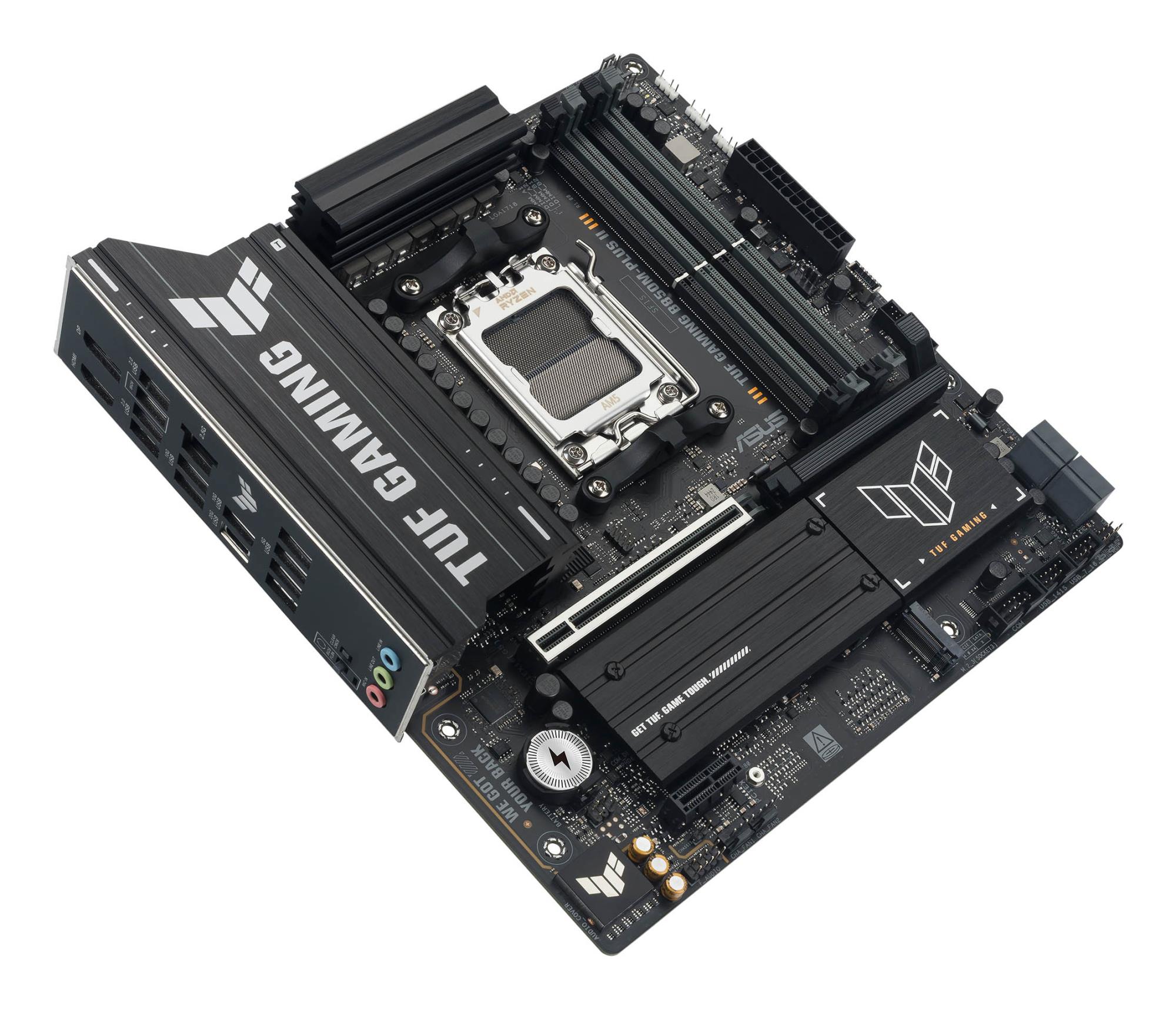 ASUS TUF GAMING B850M-PLUS II takes all the essential elements of the latest AMD Ryzen™ processors and combines them with game-ready features and proven durability. Engineered with military-grade components, an upgraded power solution and a comprehensive cooling system, this motherboard goes beyond expectations with rock-solid and stable performance for marathon gaming. TUF GAMING motherboards also undergo rigorous endurance testing to ensure that they can handle conditions where others may fail. This platform delivers the power and connectivity that advanced AI PC applications demand.