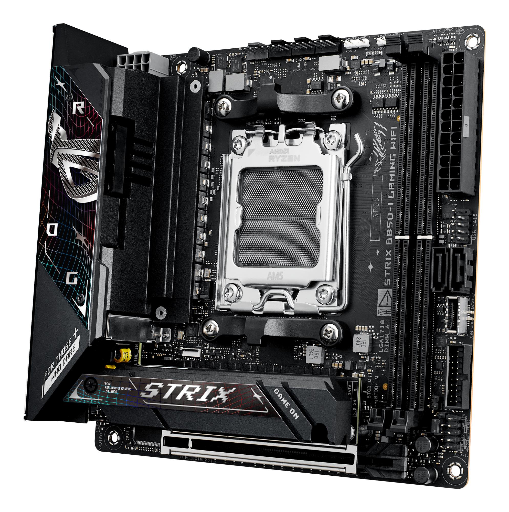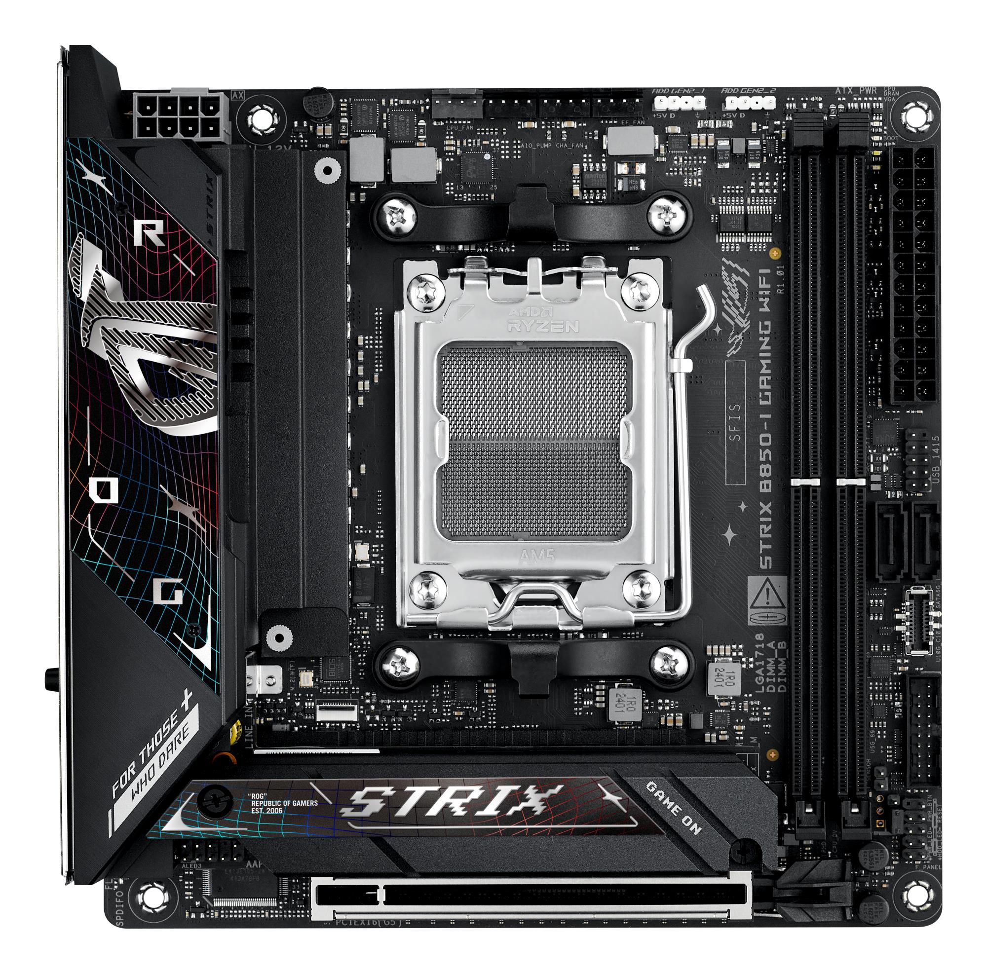 ASUS ROG STRIX B850-I GAMING WIFI. Processor manufacturer: AMD, Processor socket: Socket AM5, Compatible processor series: AMD Ryzen 7000 Series, AMD Ryzen 8000 Series, AMD Ryzen 9000 Series. Supported memory types: DDR5-SDRAM, Maximum internal memory: 96 GB, Memory slots type: DIMM. Supported storage drive interfaces: M.2, SATA III, Supported storage drive types: HDD & SSD. Maximum resolution: 4096 x 2160 pixels. Ethernet interface type: 2.5 Gigabit Ethernet, Top Wi-Fi standard: Wi-Fi 7 (802.11be), Wi-Fi standards: Wi-Fi 7 (802.11be)