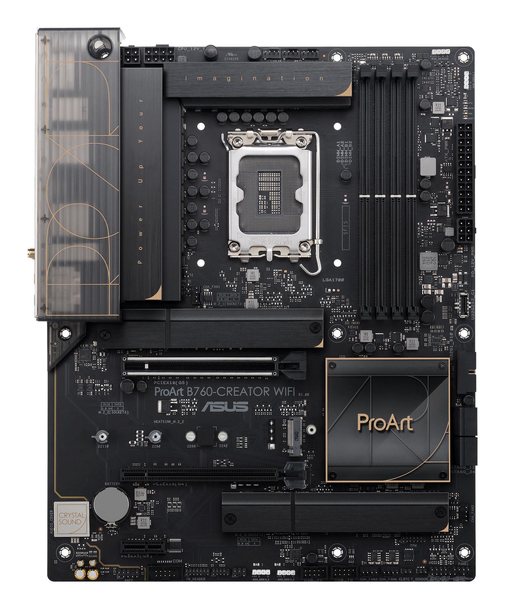 ProArt B760-Creator WiFi is an enhanced motherboard designed for content creation workloads like virtual production, 3D rendering and 4K/8K video editing. It unleashes the performance of 13th & 12th Gen Intel® Core™ processors through robust power delivery and cooling design, and its comprehensive connectivity includes three M.2 slots, WiFi 6, 2.5 Gb and 1 Gb Ethernet, a USB 3.2 Gen 2×2 Type-C® front-panel connector with 60W Quick Charge 4+ and a Thunderbolt™ 4 header.
