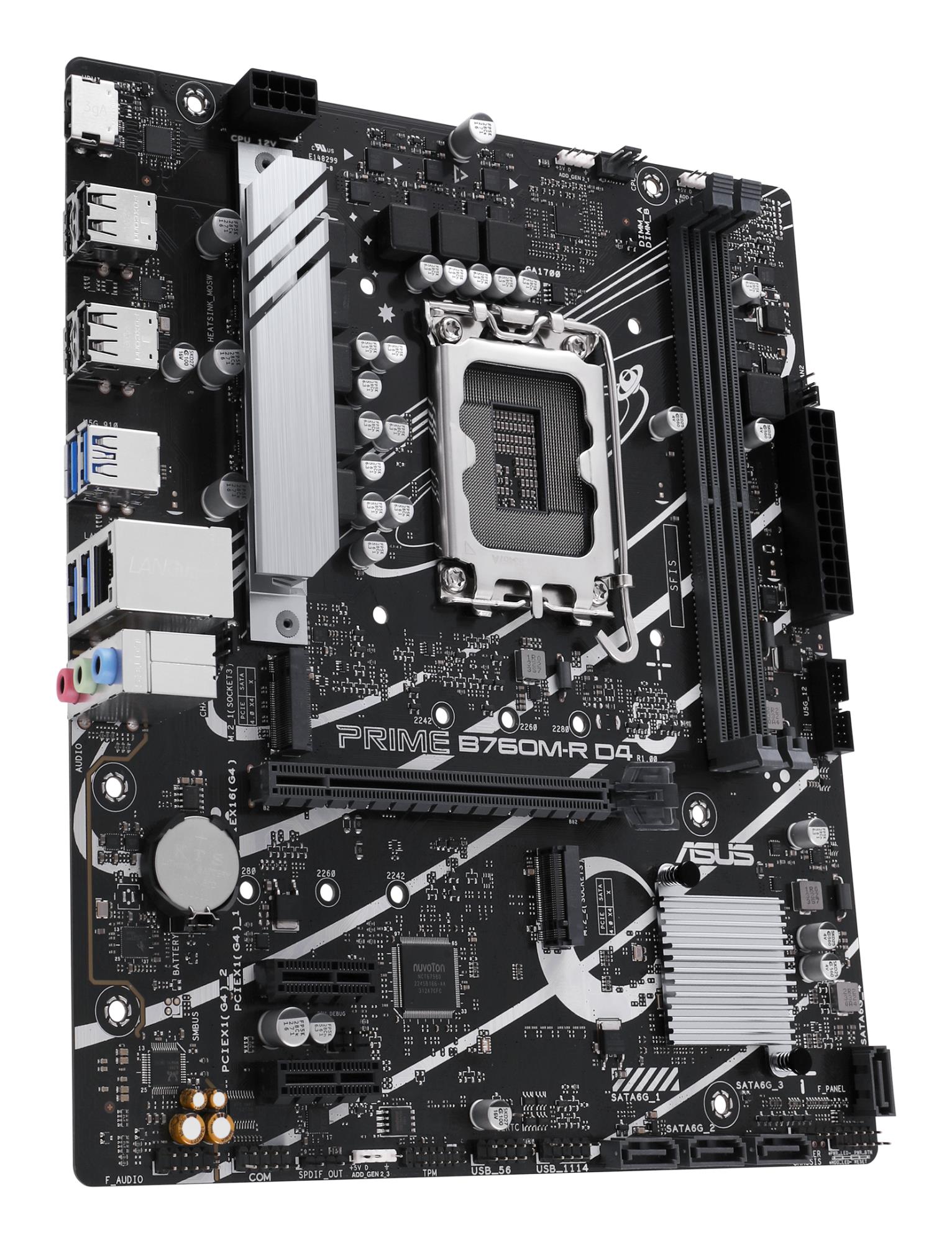 ASUS PRIME B760M-R D4. Processor manufacturer: Intel, Processor socket: LGA 1700, Compatible processor series: Intel Core i9 14th Gen, Intel Core i3 12th Gen, Intel Core i3 13th Gen, Intel Core i5 12th Gen,…. Supported memory types: DDR4-SDRAM, Maximum internal memory: 64 GB, Memory slots type: DIMM. Supported storage drive interfaces: M.2, SATA III, Supported storage drive types: HDD & SSD, RAID levels: 0, 1, 5, 10. Ethernet interface type: 2.5 Gigabit Ethernet. Component for: PC, Motherboard form factor: micro ATX, Motherboard chipset family: Intel