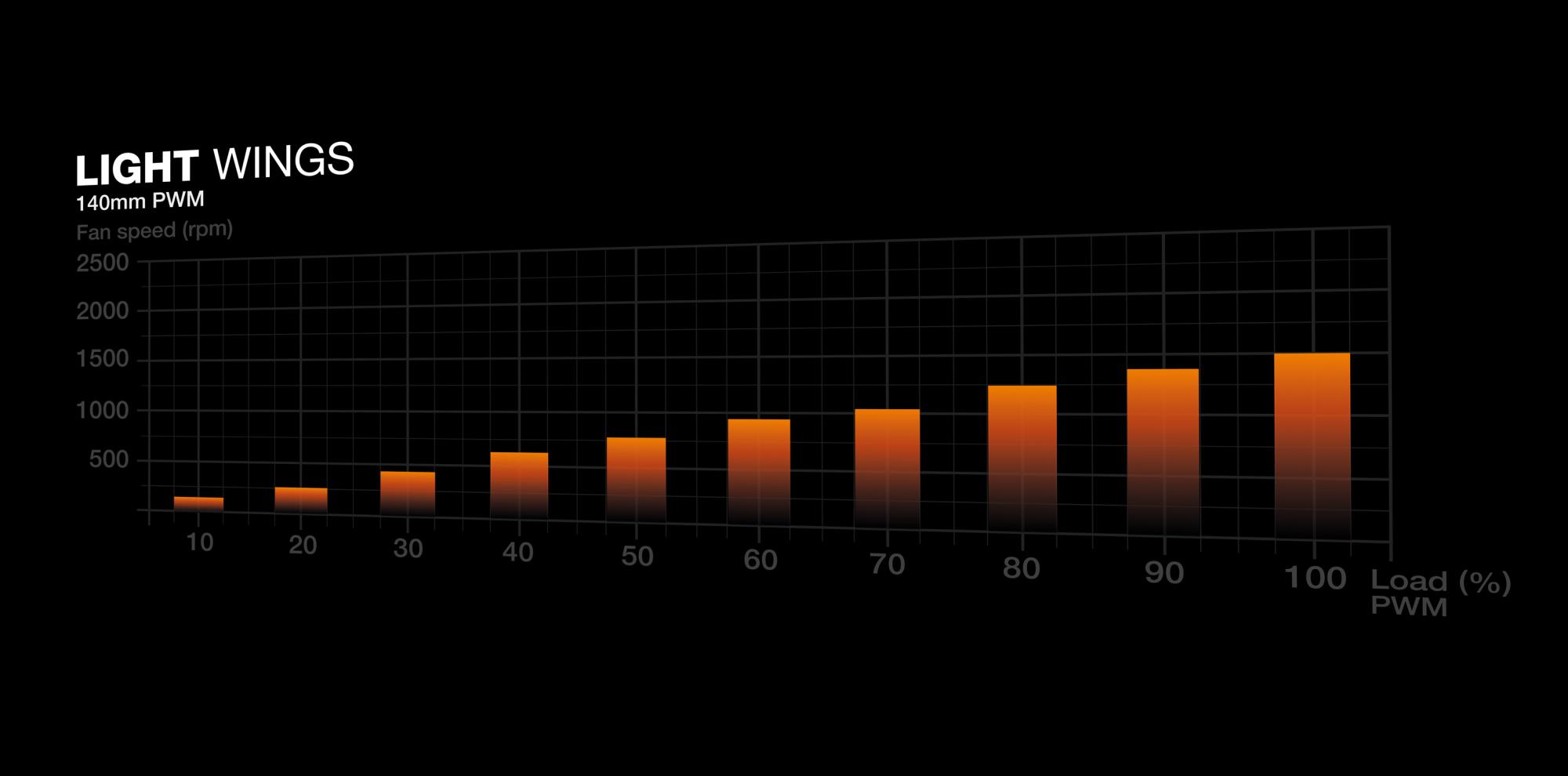Light Base 900 FX White comes with 4 pre-installed Light Wings fans. One fan is installed as rear exhaust, 3 Light Wings 140mm PWM White fans with reversed fan blades are pre-installed on the side mounting. The reverse fans make sure your system is still an eye-catcher when installed as a side intake. Their 7 airflow-optimized fan blades not only reduce noise-generating turbulences but also ensure that this fan provides the performance that is needed, even in demanding configurations.
