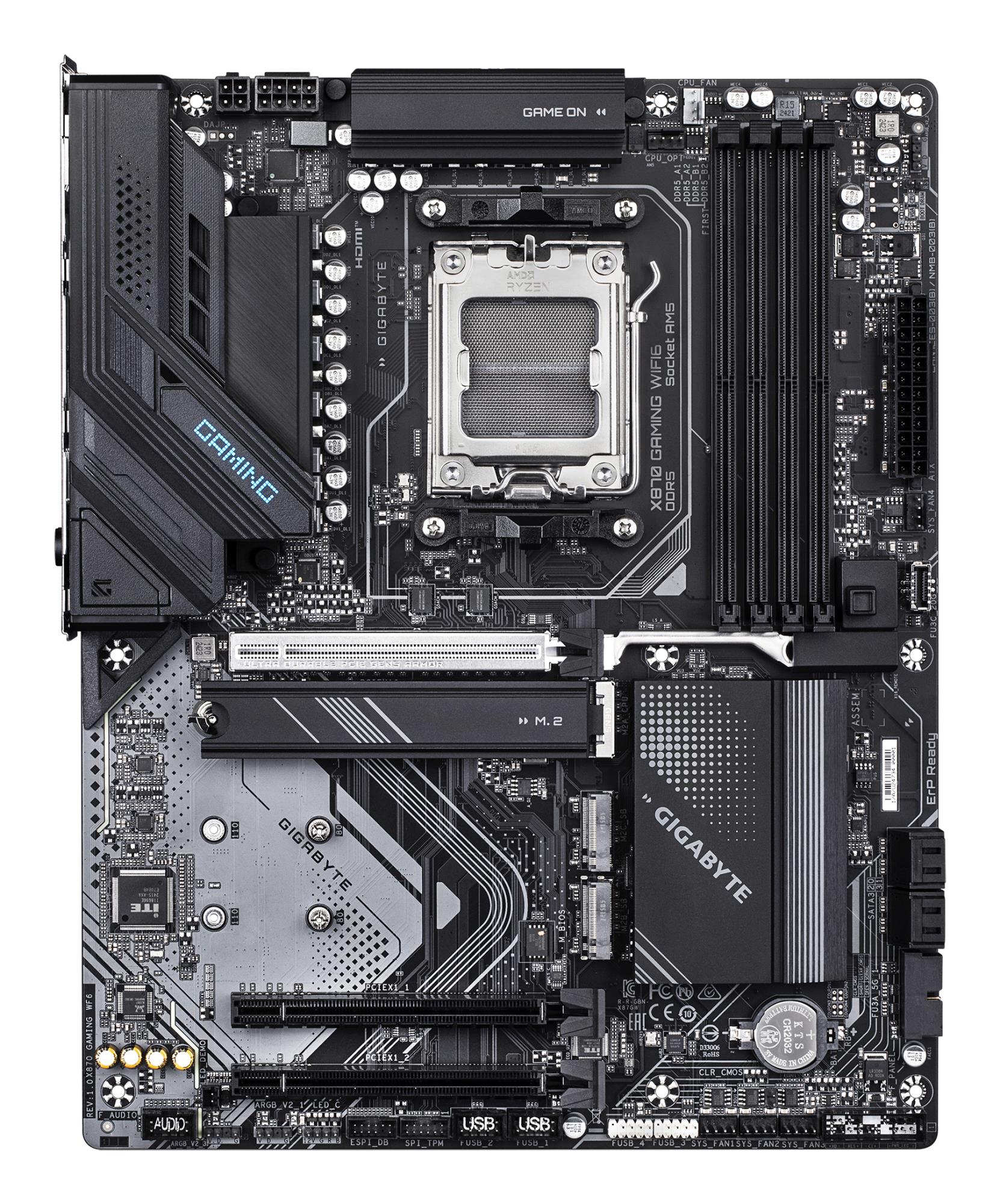 GIGABYTE X870 GAMING WIFI6 Motherboard – Supports AMD Ryzen 9000 CPUs, 8+2+2 phases VRM, up to 8000MHz DDR5 (OC), 1xPCIe 5.0 + 2xPCIe 4.0, Wi-Fi 6, 2.5GbE LAN, USB 4. Processor manufacturer: AMD, Processor socket: Socket AM5, Compatible processor series: AMD Ryzen™ 7. Supported memory types: DDR5-SDRAM, Maximum internal memory: 256 GB, Memory slots type: DIMM. Supported storage drive interfaces: M.2, SATA III, Supported storage drive types: HDD & SSD, RAID levels: 0, 1, 10. Ethernet interface type: 2.5 Gigabit Ethernet, Top Wi-Fi standard: Wi-Fi 6 (802.11ax), Wi-Fi standards: 802.11b, 802.11g, Wi-Fi 4 (802.11n), Wi-Fi 5 (802.11ac), Wi-Fi 6 (802.11ax), Wi-Fi 7 (802.11be). Component for: PC, Motherboard form factor: ATX, Motherboard chipset family: AMD