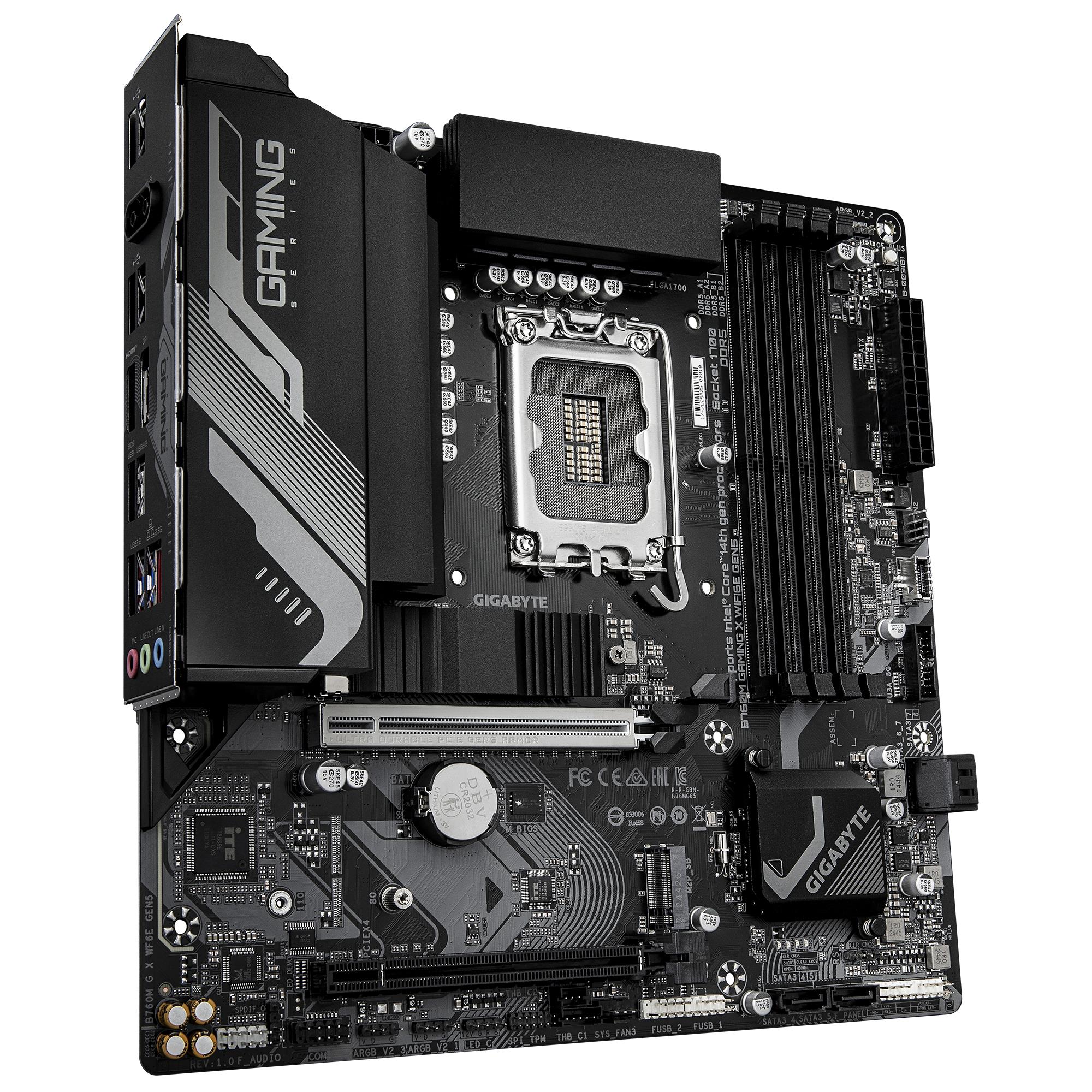 GIGABYTE B760M GAMING X WIFI6E GEN5 Motherboard – Supports 14th Gen. Intel Core CPUs, 8+1+1 phases VRM, up to 5600MHz DDR5, 2xPCIe 4.0 M.2, Wi-Fi 6E, 2.5 GbE LAN, USB 3.2 Gen 1. Processor manufacturer: Intel, Processor socket: LGA 1700, Compatible processor series: Intel® Celeron®, Intel Core i3 12th Gen, Intel Core i3 13th Gen, Intel Core i3 14th Gen, Intel…. Supported memory types: DDR5-SDRAM, Maximum internal memory: 256 GB, Memory slots type: DIMM. Supported storage drive interfaces: M.2, PCI Express 4.0, SATA III, Supported storage drive types: HDD & SSD, RAID levels: 0, 1, 5, 10. Maximum resolution: 4096 x 2304 pixels. Ethernet interface type: 2.5 Gigabit Ethernet, LAN controller: Realtek RTL8125, Top Wi-Fi standard: Wi-Fi 6E (802.11ax)