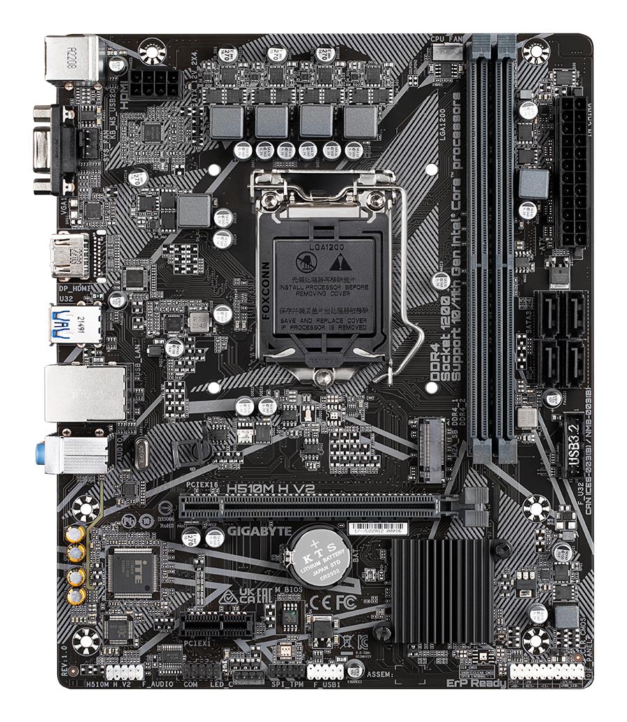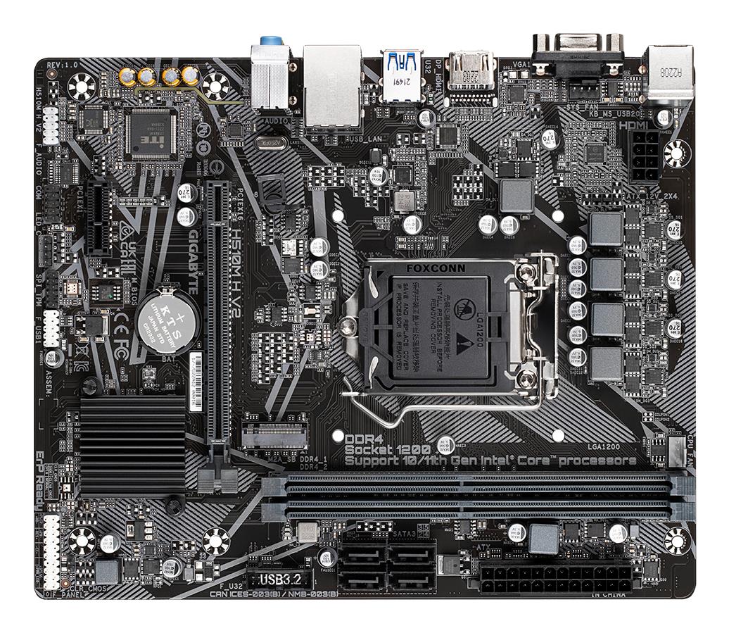 GIGABYTE H510M H V2 Motherboard – Supports Intel Core 11th CPUs, up to 3200MHz DDR4, 1xPCIe 3.0 M.2, GbE LAN, USB 3.2 Gen 1. Processor manufacturer: Intel, Processor socket: LGA 1200 (Socket H5), Compatible processor series: Intel® Celeron®, Intel® Core™ i3, Intel® Core™ i5, Intel® Core™ i7, Intel® Core™ i9, Intel® Pentium®. Supported memory types: DDR4-SDRAM, Maximum internal memory: 64 GB, Memory slots type: DIMM. Supported storage drive interfaces: M.2, PCI Express 3.0, SATA III, Supported storage drive types: HDD & SSD. Maximum resolution: 4096 x 2304 pixels. USB connector type: USB Type-A