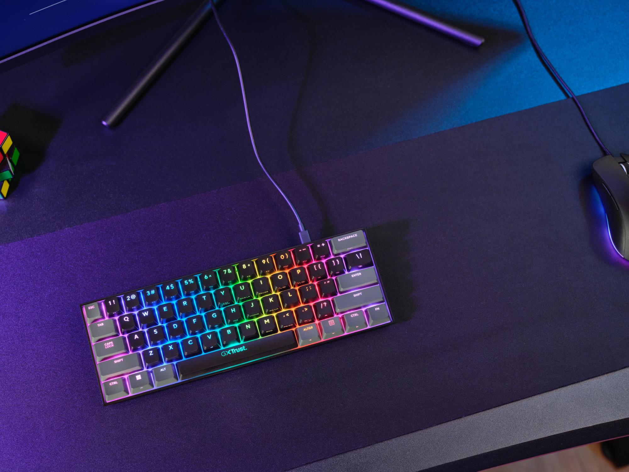 Trust GXT 867 Acira. Keyboard form factor: 60%, Connectivity technology: Wired, Device interface: USB, Keyboard key switch: Mechanical, Keyboard layout: QWERTY, Keyboard number of keys: 61. Cable length: 1.8 m. Recommended usage: Gaming. Product colour: Black