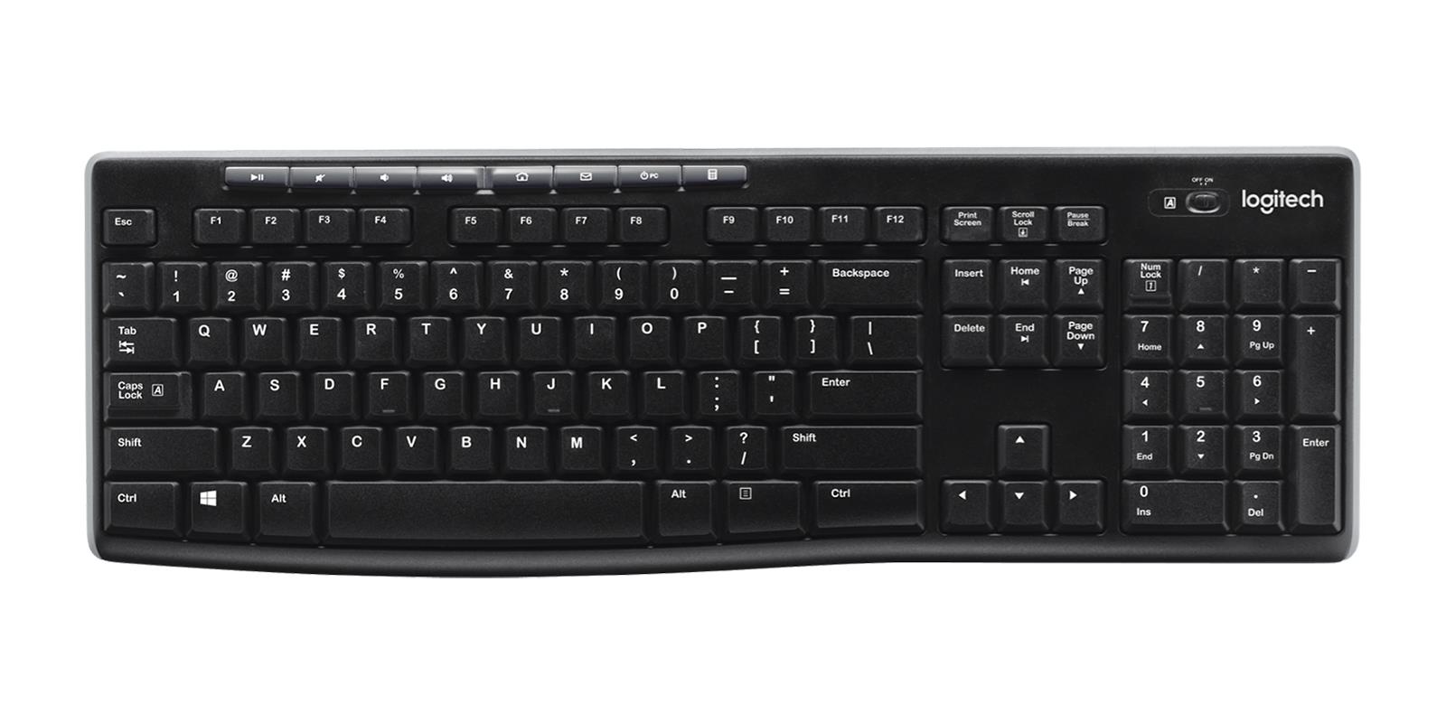 Logitech Wireless Keyboard K270. Keyboard form factor: Full-size (100%). Keyboard style: Straight. Connectivity technology: Wireless, Device interface: RF Wireless, Keyboard layout: QWERTY, Recommended usage: Home. Product colour: Black