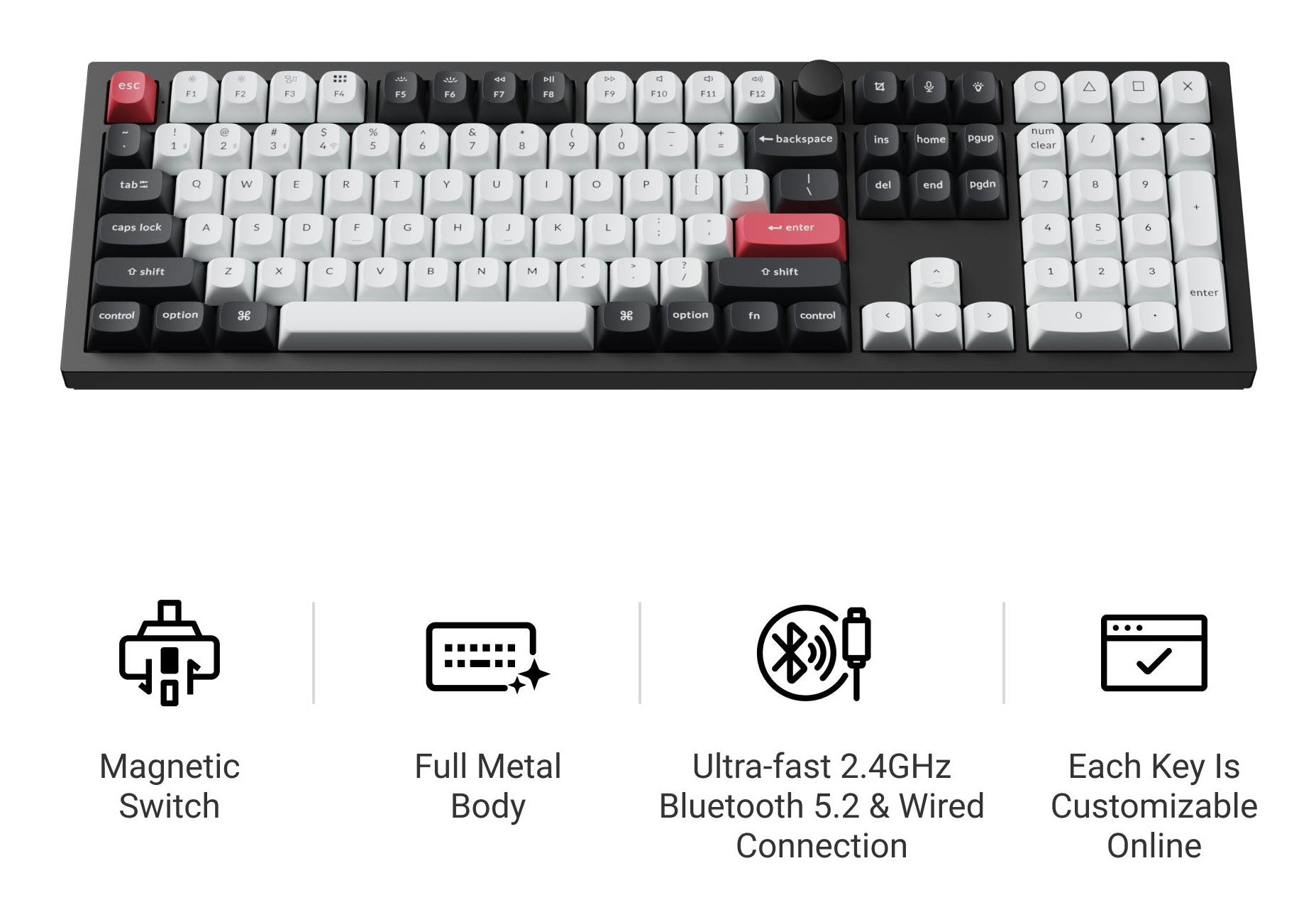 Meet the Q6 HE, a full-size (100%) layout wireless QMK custom keyboard equipped with Hall Effect Gateron double-rail magnetic switches. These switches provide a distinct advantage due to their unique mechanism, offering faster feedback, dynamic rapid triggering, and adjustable actuation points, resulting in epic enhancements for the gaming experience tailored to your individual preferences.