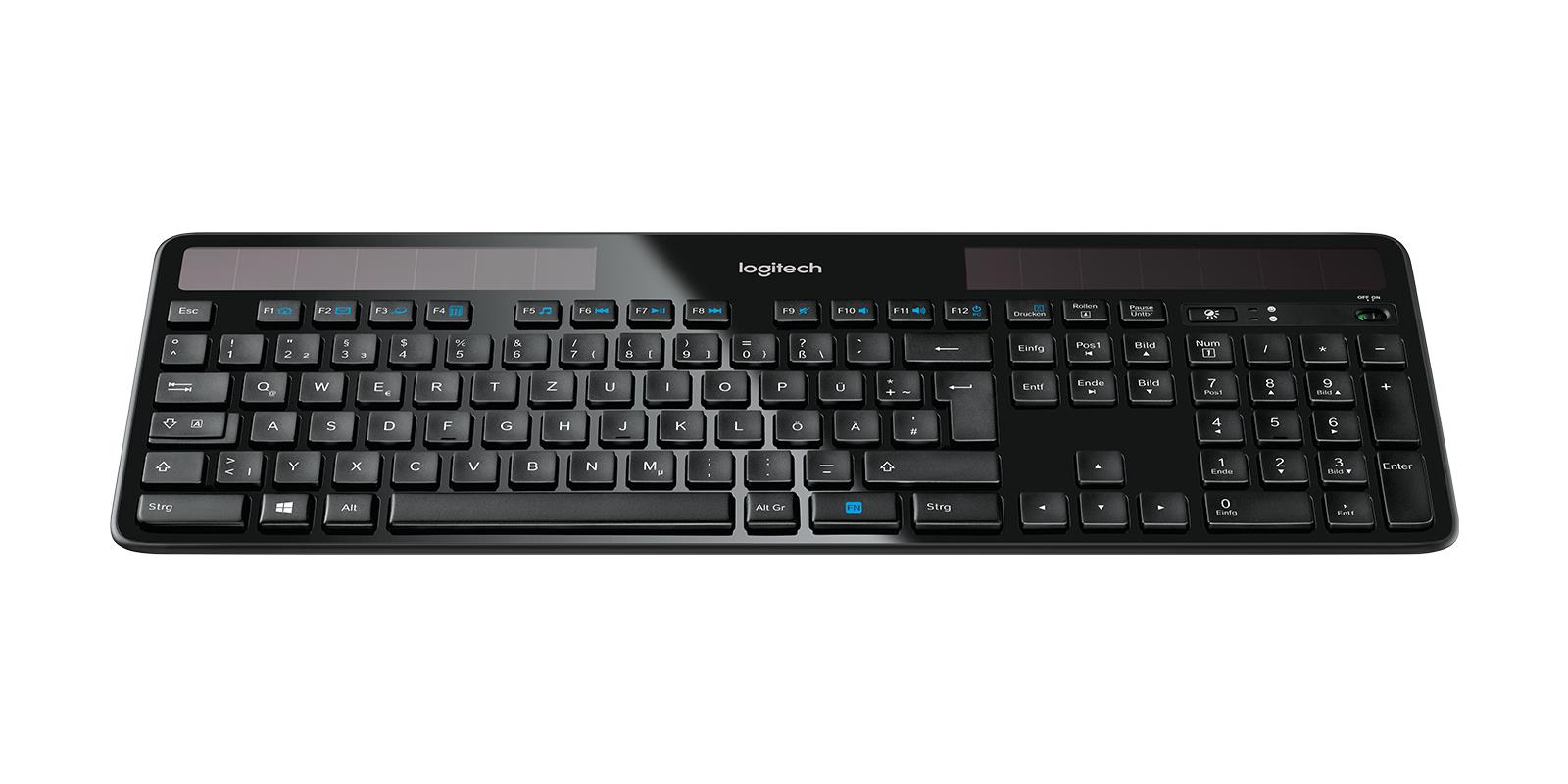 Logitech Wireless Solar Keyboard K750. Keyboard form factor: Full-size (100%). Keyboard style: Straight. Connectivity technology: Wireless, Device interface: RF Wireless, Keyboard layout: QWERTZ, Keyboard number of keys: 104, Recommended usage: Universal. Product colour: Graphite