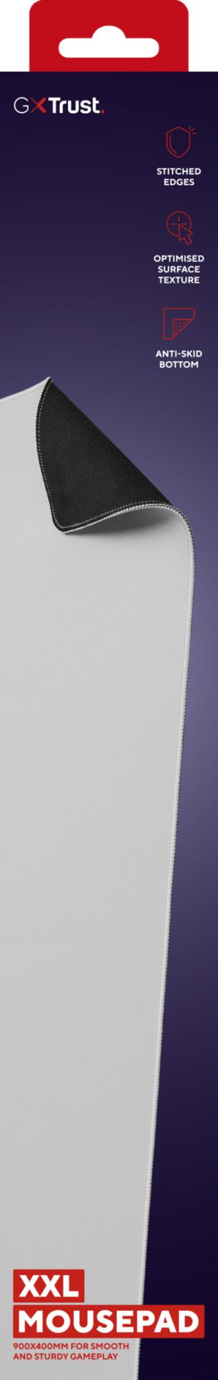 Trust GXT 759W. Width: 900 mm, Depth: 400 mm. Product colour: White, Surface coloration: Monochromatic, Material: Polyethylene terephthalate (PET), Stitched edges, Non-slip base, Gaming mouse pad