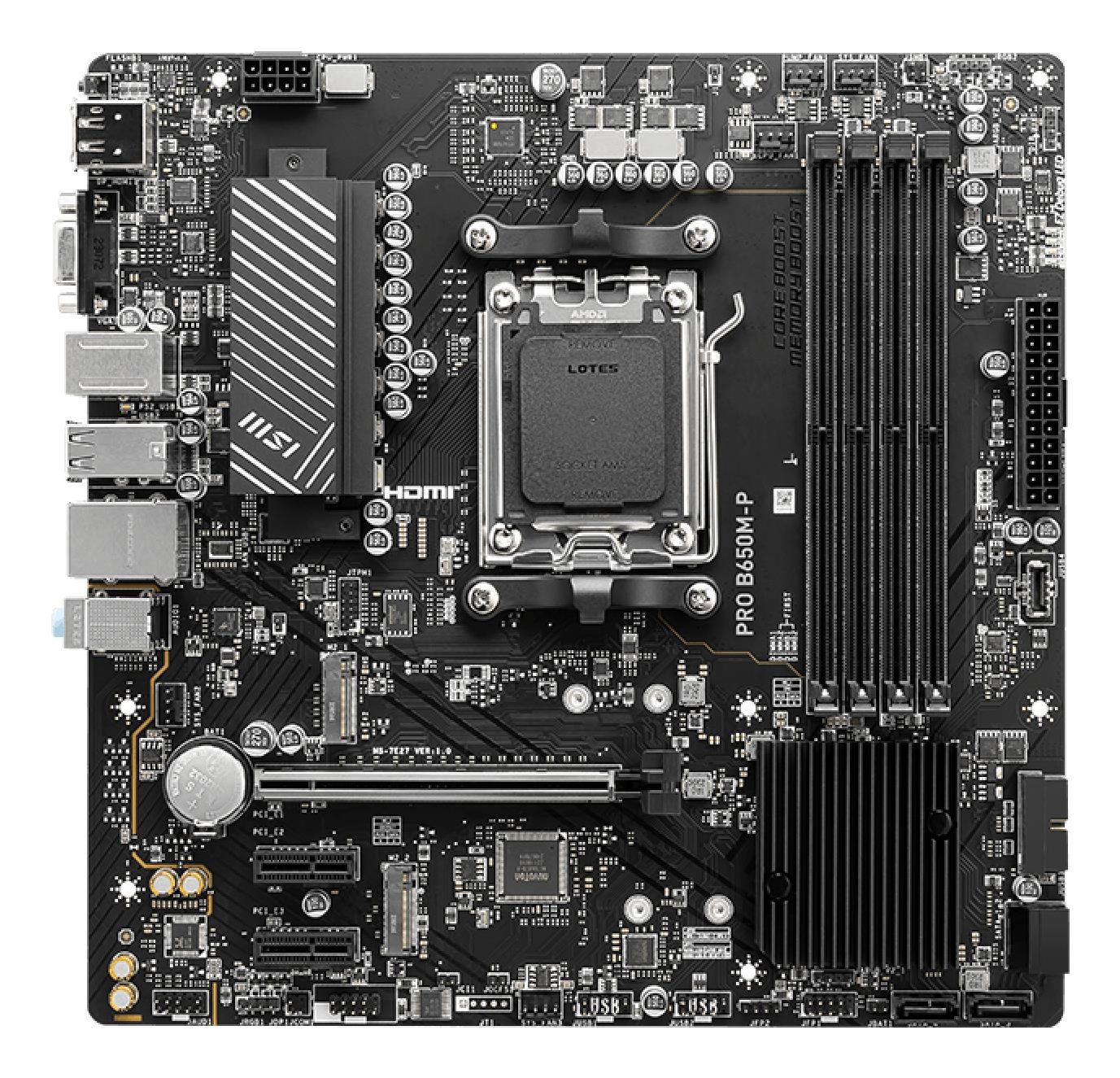 MSI PRO B650M-P. Processor manufacturer: AMD, Processor socket: Socket AM5, Compatible processor series: AMD Ryzen 7000 Series. Supported memory types: DDR5-SDRAM, Maximum internal memory: 192 GB, ECC сompatibility: Non-ECC. Supported storage drive interfaces: M.2, SATA, RAID levels: 0, 1, 10. Ethernet interface type: 2.5 Gigabit Ethernet, LAN controller: Realtek RTL8125-BG. Component for: PC, Motherboard form factor: micro ATX, Motherboard chipset family: AMD