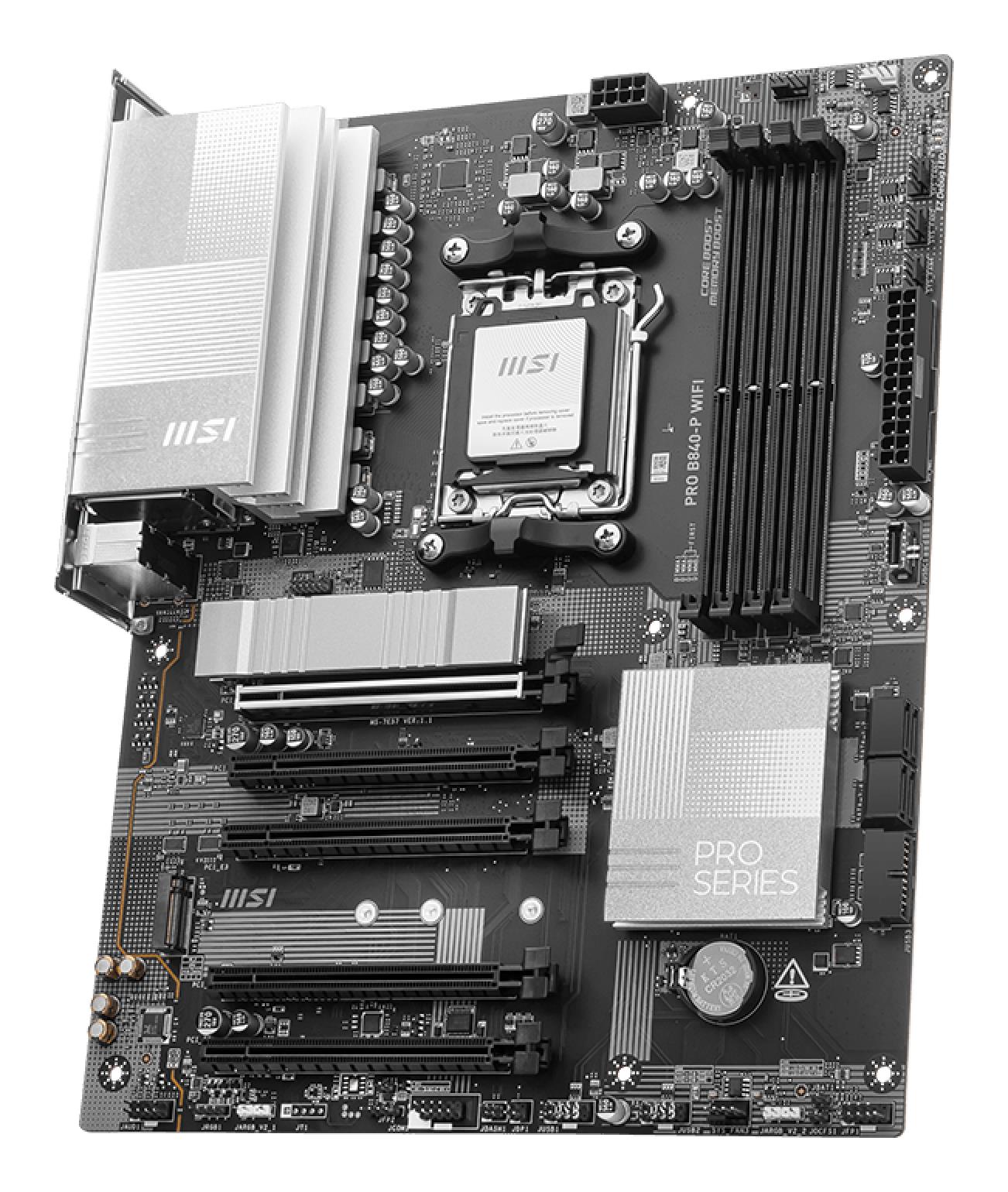MSI PRO B840-P WIFI. Processor manufacturer: AMD, Processor socket: Socket AM5, Compatible processor series: AMD Ryzen 7000 Series, AMD Ryzen 8000 Series, AMD Ryzen 9000 Series. Supported memory types: DDR5-SDRAM, Maximum internal memory: 256 GB, Memory slots type: DIMM. Supported storage drive interfaces: M.2, Micro SATA III, Supported storage drive types: HDD & SSD, RAID levels: 0, 1, 10. Ethernet interface type: 2.5 Gigabit Ethernet, Top Wi-Fi standard: Wi-Fi 7 (802.11be), Wi-Fi standards: 802.11a, 802.11b, 802.11g, Wi-Fi 4 (802.11n), Wi-Fi 5 (802.11ac), Wi-Fi 6 (802.11ax), Wi-Fi 6E…. Component for: PC, Motherboard form factor: ATX, Motherboard chipset family: AMD