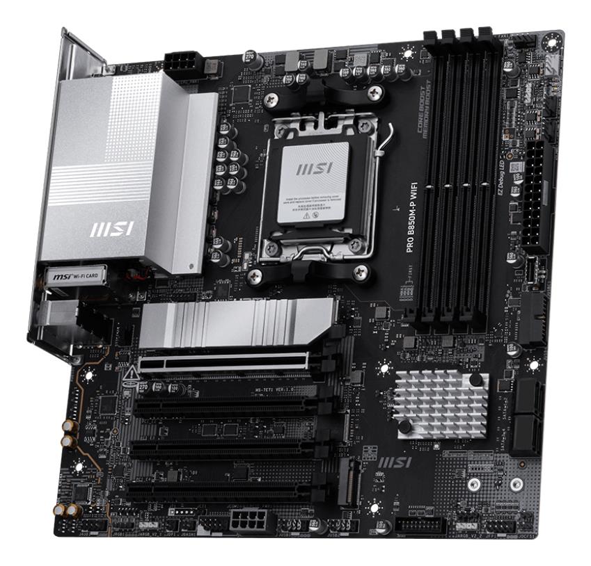 PRO B850M-P WIFI offers a simple design with a harmonious silver color scheme that perfectly matches both white and black PC builds. It is engineered with many exclusive features of MSI, a Wi-Fi 7 with EZ Antenna, 5G LAN, PCIe 5.0 M.2 with EZ M.2 Shield Frozr II, and Supplemental PCIe Power, ready for the AMD Ryzen™ 9000 series processors.