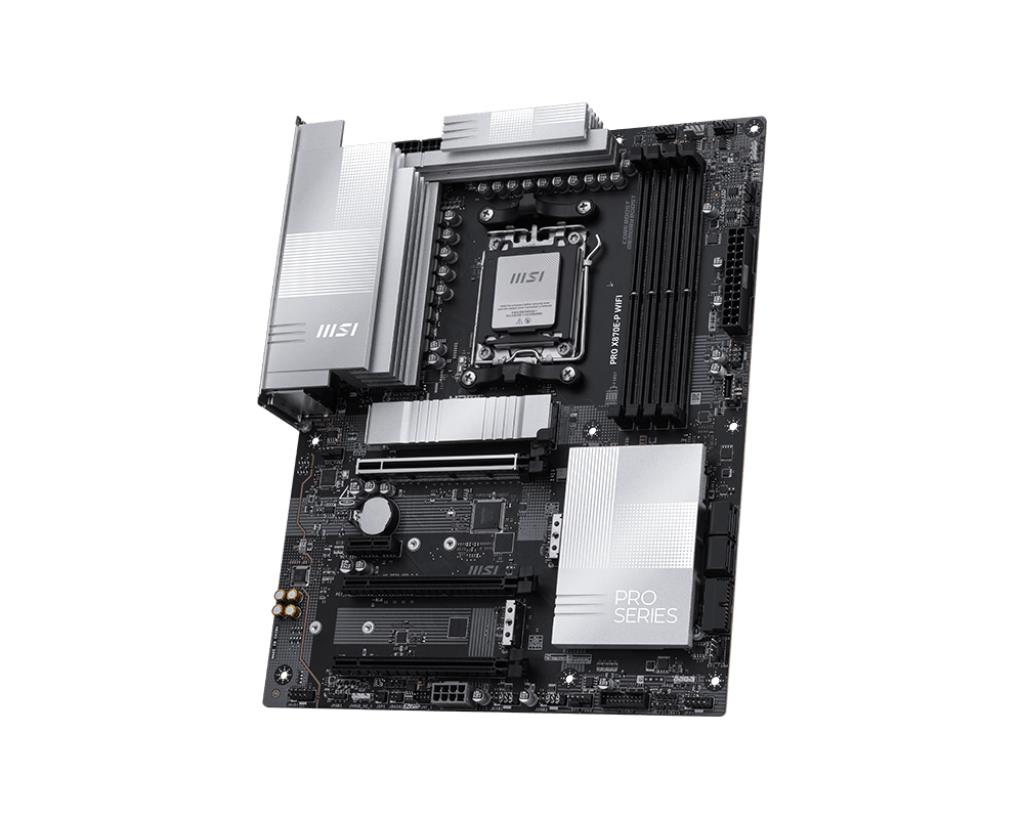 PRO X870E-P WIFI offers a simple design with a harmonious silver color scheme that perfectly matches both white and black PC builds. It is engineered with many exclusive features of MSI, a true Wi-Fi 7 with EZ Antenna, 5G LAN, PCIe 5.0 M.2 with EZ M.2 Shield Frozr II, and Supplemental PCIe Power, ready for the AMD Ryzen™ 9000 series processors.
