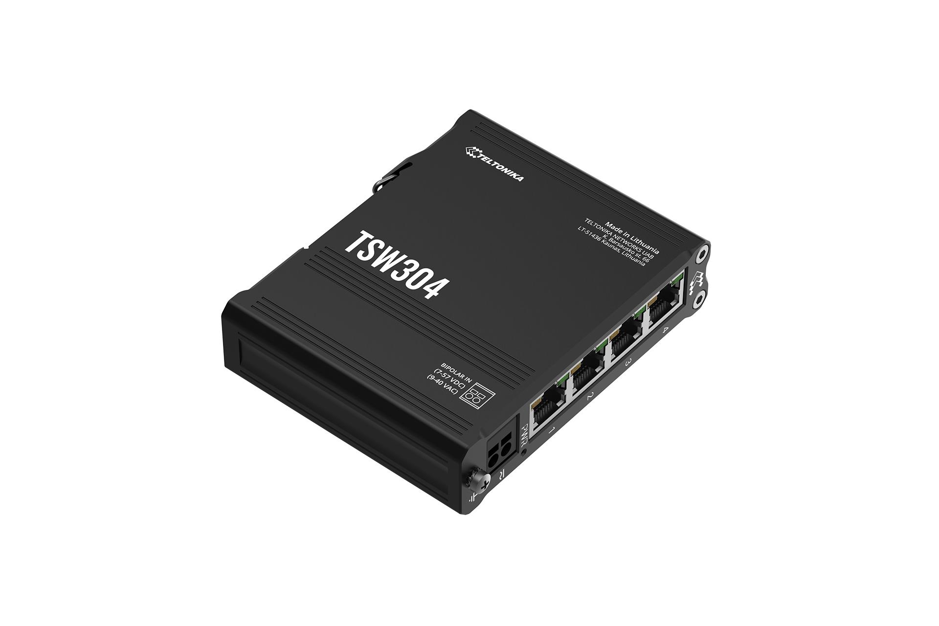 TSW304 is the tiniest Ethernet switch in the Teltonika Networks portfolio, made with the industrial application scenarios in mind. This ultra-small device comes with an integrated DIN rail mounting option and will easily find its place in any server cabinet. Durable design and shock-resistant casing make it perfect for even the most challenging industrial environments.