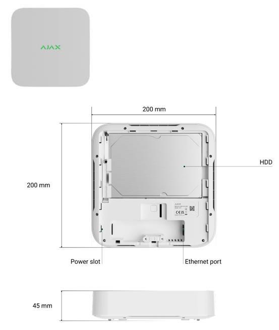 16 channels, up to 4K, H.265/H.264, up to 100 Mbps bandwidth, up to 16 TB 3.5” disk storage (not included). Compatible with all Ajax hubs