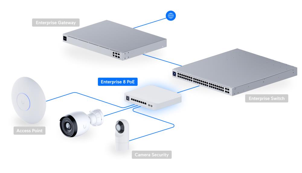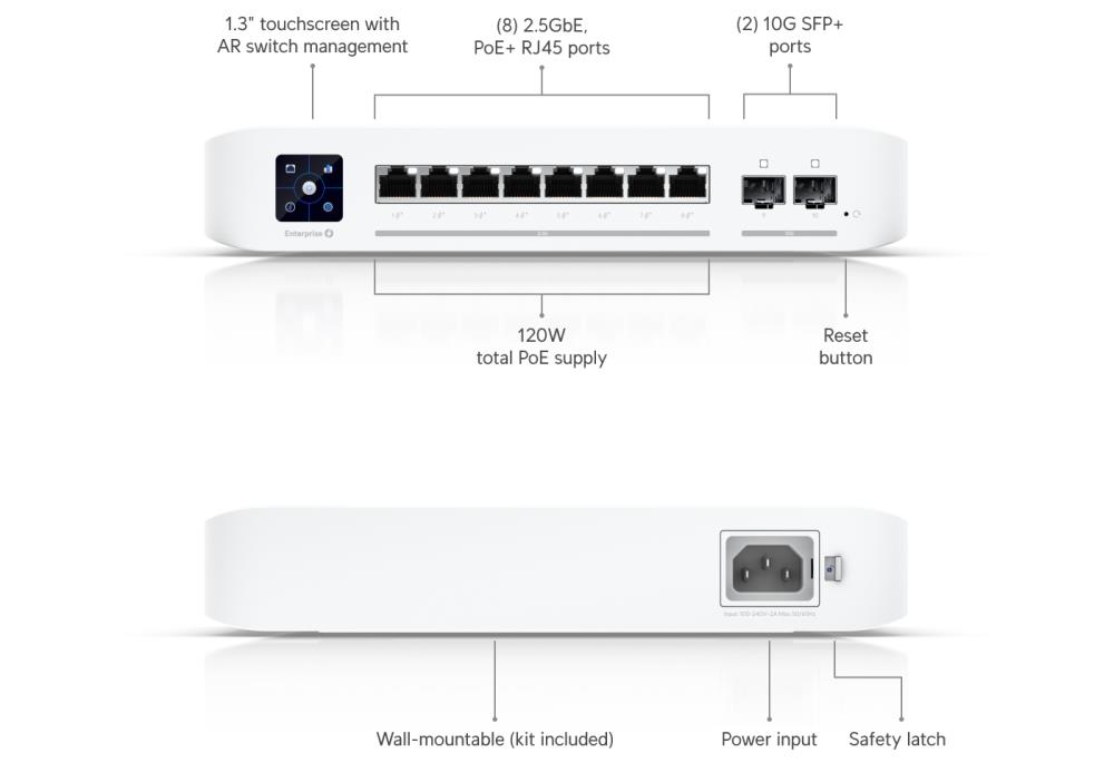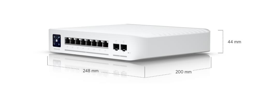 The Switch Enterprise 8 PoE (USW Enterprise 8 PoE) is a fully managed, Layer 3* switch with (8) 2.5GbE, 802.3at PoE+ RJ45 ports and (2) 10G SFP+ ports.The USW Enterprise 8 PoE also features a 1.3" LCM color touchscreen that concisely displays key system and connection insights. This switch can be monitored or configured from anywhere with the powerful, intuitive UniFi Network web application and mobile app.